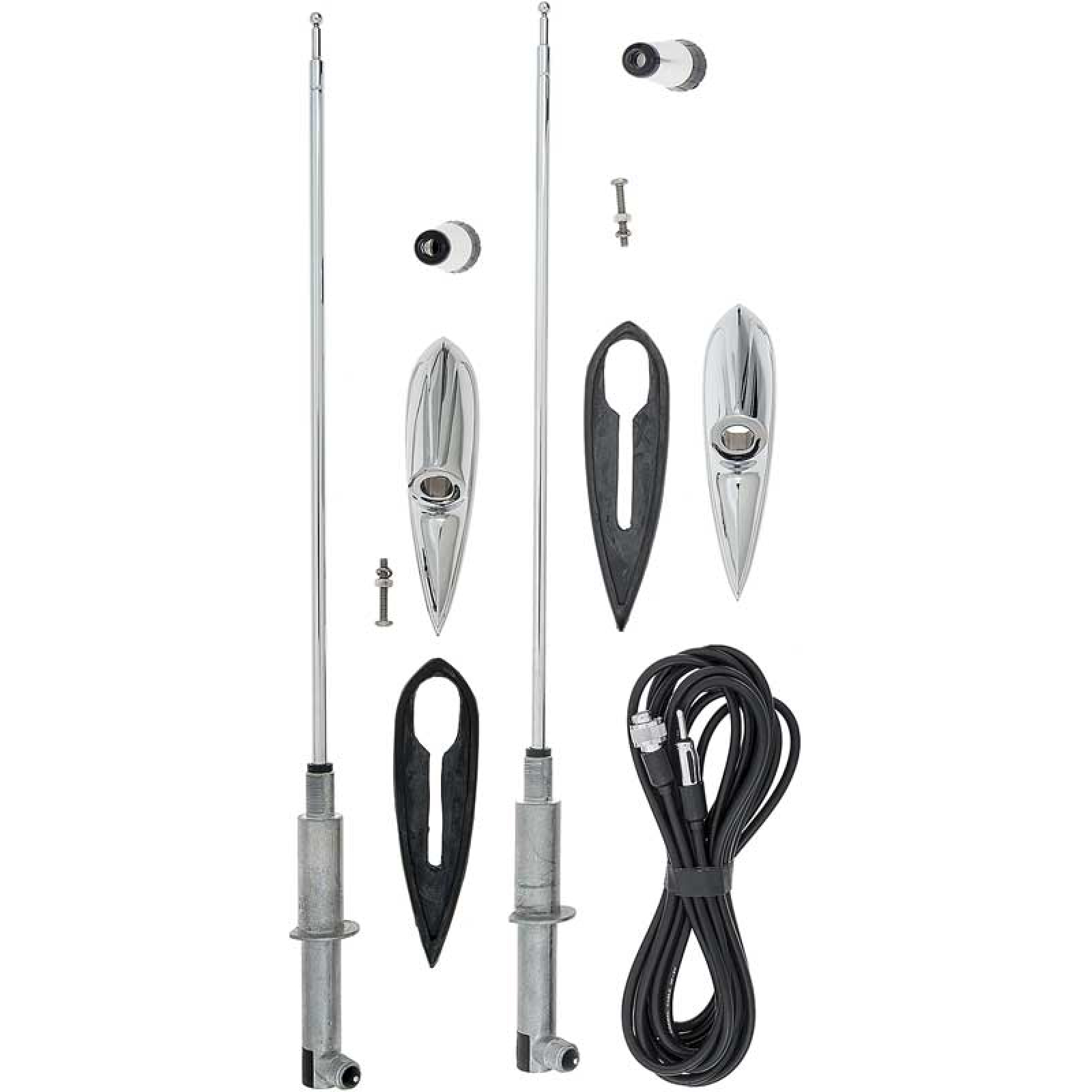 Description Description 1959 Chevrolet Full Size Rear Antennas - Set (New) Left Side is a Dummy Antenna; Right Side is a Working Antenna; Includes Cable; Measures 50" at full extension from Base to Tip; 15" when not extended View AllClose
